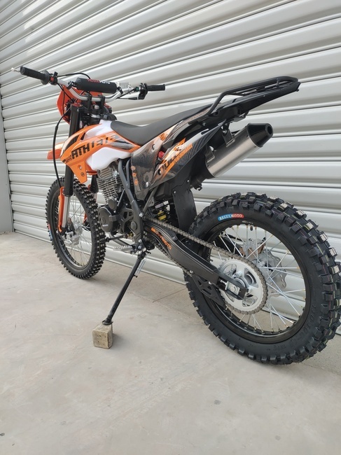 Не смотря на доступность, мотоцикл отличается продуманным подбором комплектующих, что делает его эксплуатацию более комфортной. В стоке уже установлены фара головного света, ручка акселератора с коротким ходом, буксаторы на обоих колесах, замок зажигания и багажник. Еще одной особенностью данной модели является наличие у Regulmoto Athlete ПТС – байк можно поставить на учет и передвигаться по дорогам общего пользования, поставив необходимое дополнительное оборудование.